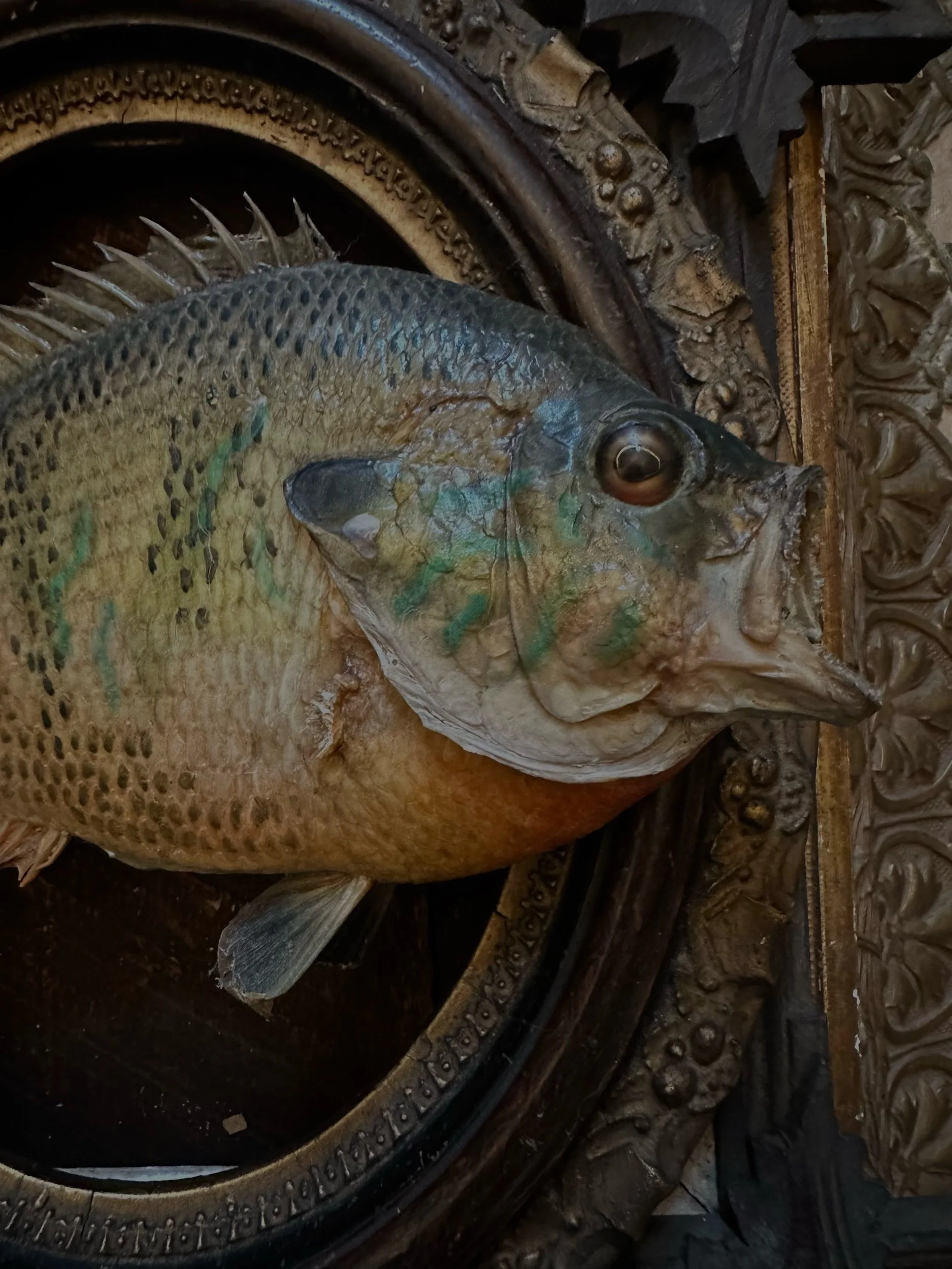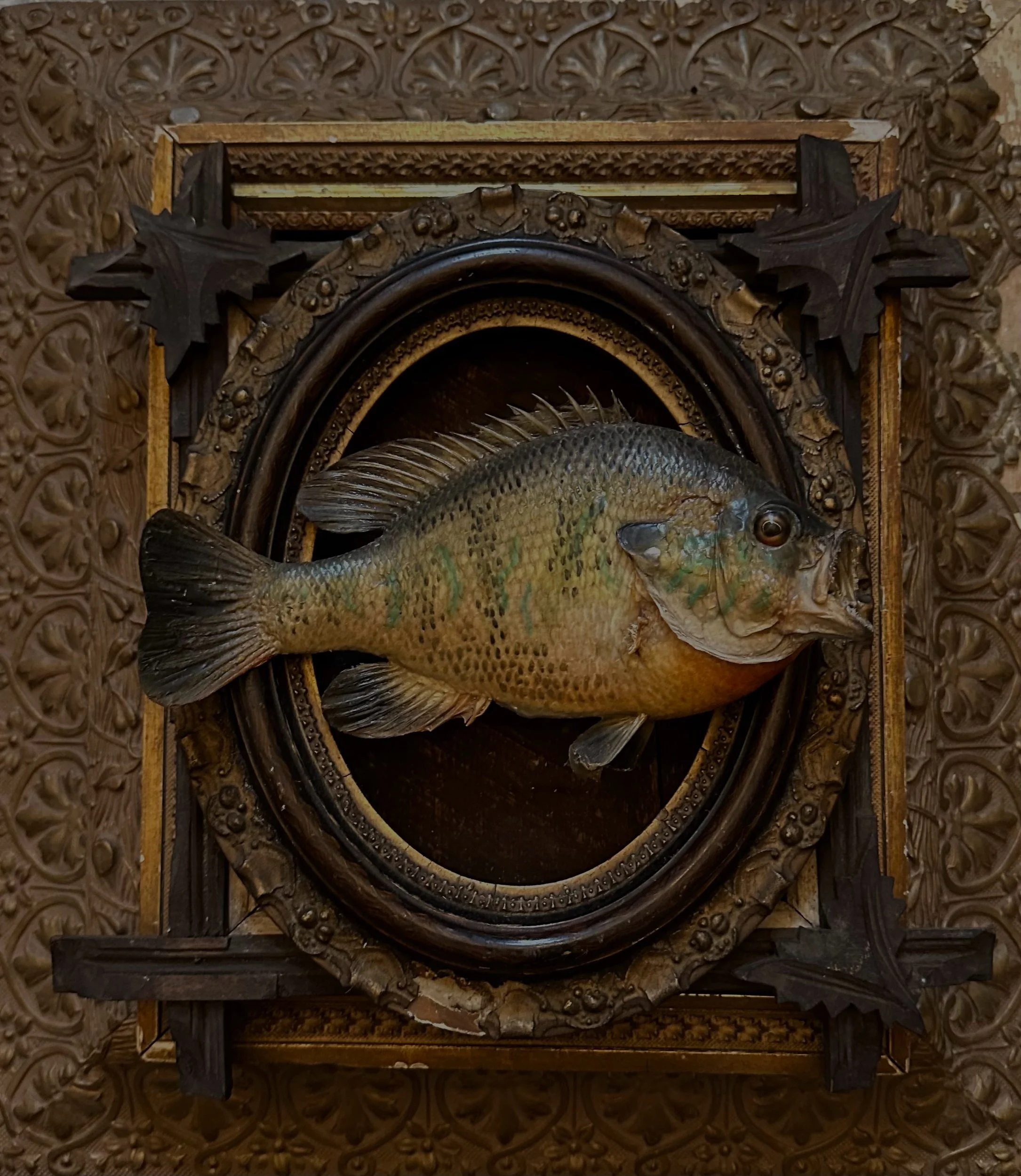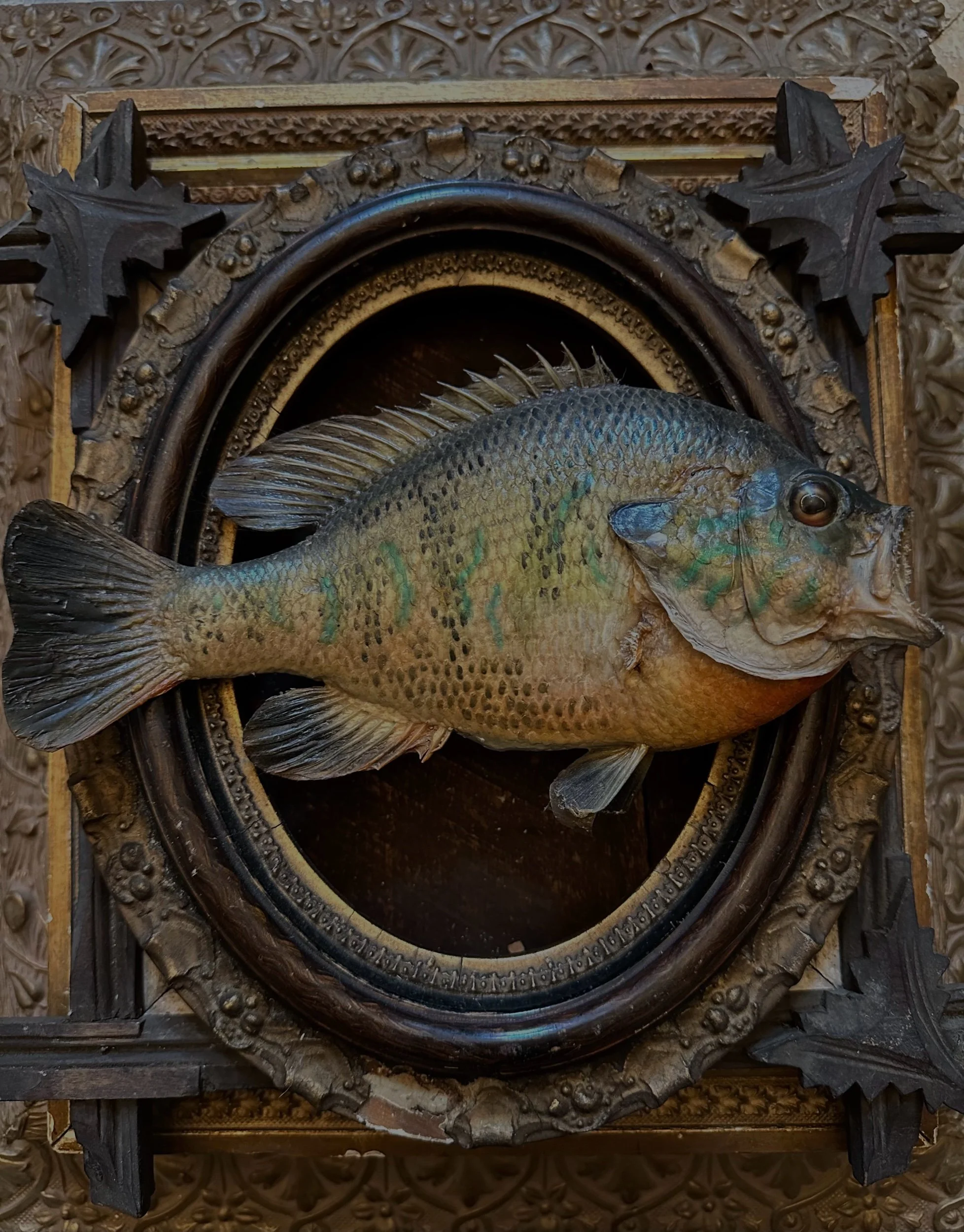 This is a real skin mount of a bluegill- please note the peeled pelvic fin. This little fella is ready to hang on the wall or balance delicately on a curio shelf.